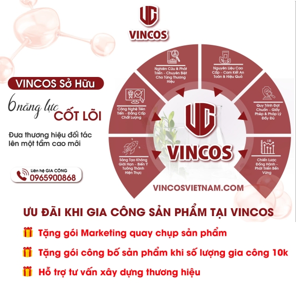 VINCOS tự hào là Nhà máy Gia công Mỹ phẩm chuyên nghiệp với đội ngũ chuyên môn là các Bác sĩ, Dược sĩ và Tiến sĩ Hoá Sinh, đội ngũ R&D dày dặn kinh nghiệm được đào tạo bài bản ở nước ngoài cùng sự chuyển giao công nghệ từ các đối tác độc quyền của các nhà máy lớn từ Nhật như Cosfa, Romessence từ Pháp và từ 3 nhà máy top đầu Hàn Quốc…